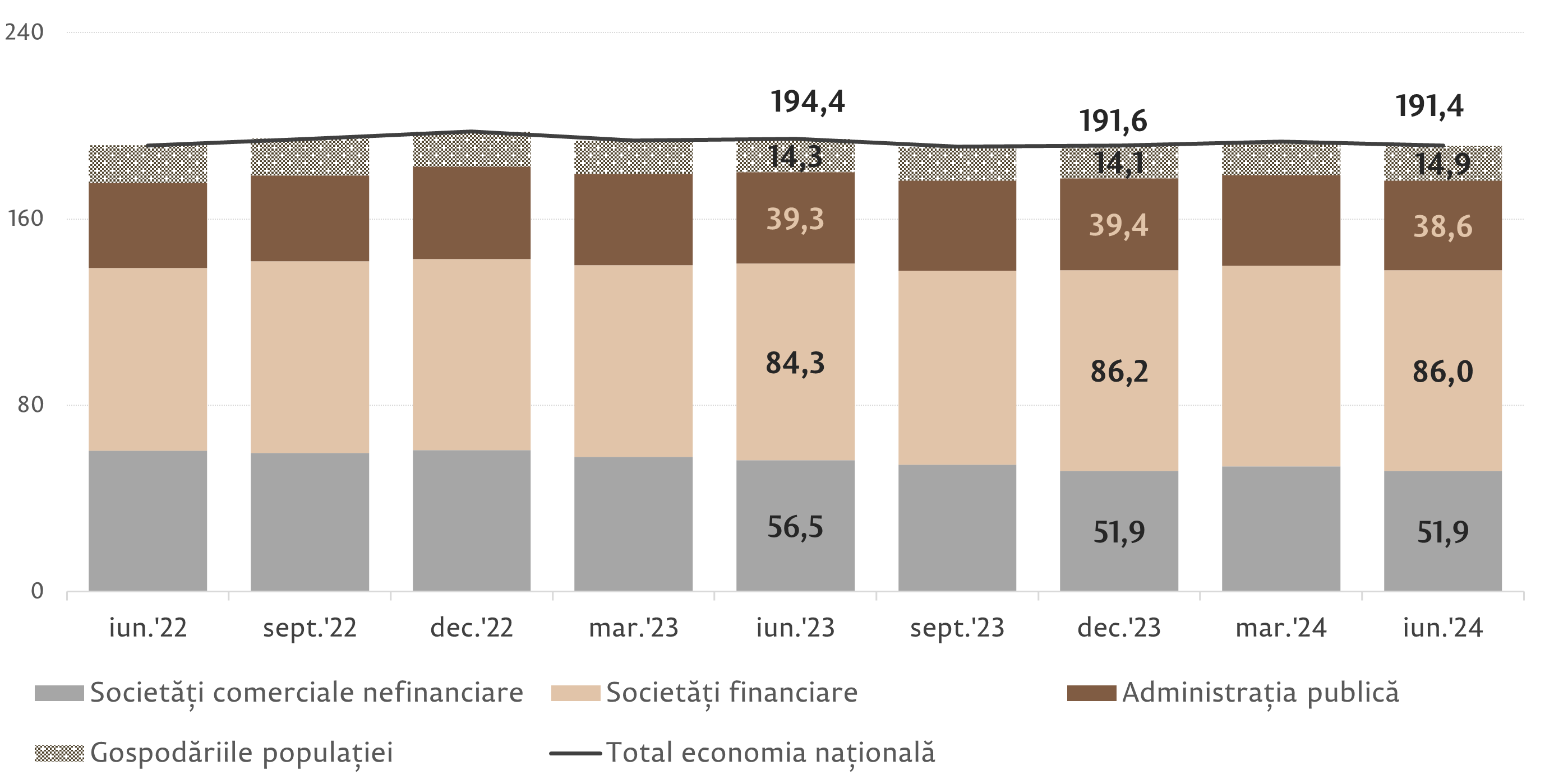 Raportul dintre datoria totală a sectoarelor economiei naționale și PIB, la 30 iunie 2024, a constituit 191,4 la sută, fiind cu 0,2 puncte procentuale mai mic decât indicatorul respectiv la 31 decembrie 2023 (diagrama 5).