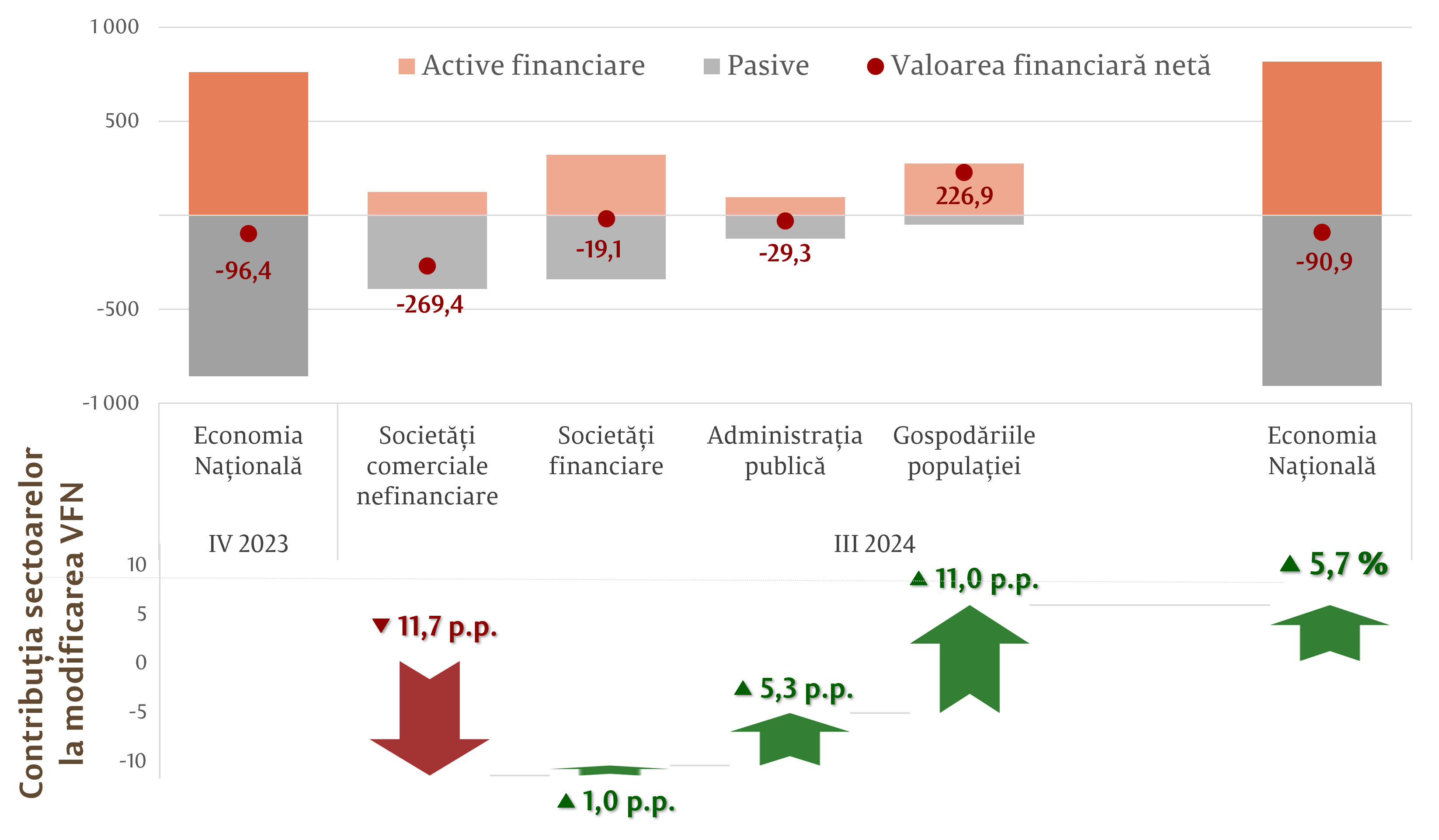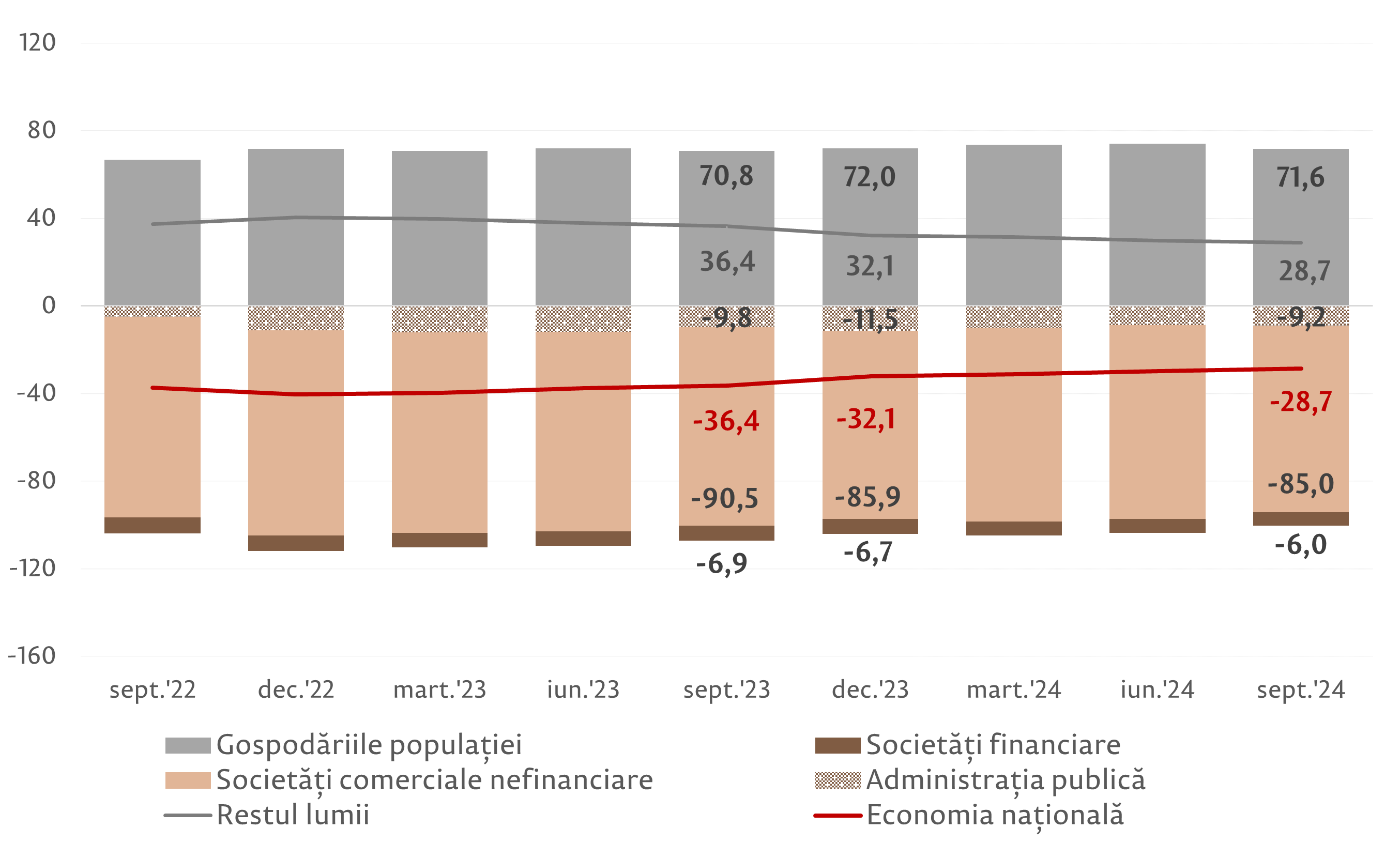 Sectorul gospodăriilor populației continuă să fie creditorul net al economiei naționale, iar sectorul societăților comerciale nefinanciare, sectorul societăților financiare și sectorul administrației publice se află, la fel ca în perioadele precedente, pe poziția de debitor net (a se vedea tabelul de mai jos).