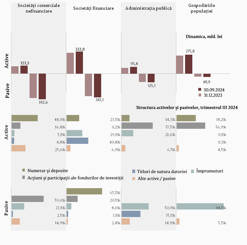 Activele sectorului gospodăriilor populației au constituit 275,8 mld. lei (+6,6 la sută comparativ cu 31.12.2023), fiind formate, în mare parte, din participațiile în capital și din numerar și depozite: 56,9 la sută și 38,2 la sută, respectiv, din totalul activelor sectorului dat. Totodată, angajamentele sectorului gospodăriilor populației au însumat 48,9 mld. lei (+15,3 la sută), fiind constituite, în principal, din împrumuturi contractate (94,5 la sută din totalul pasivelor sectorului).