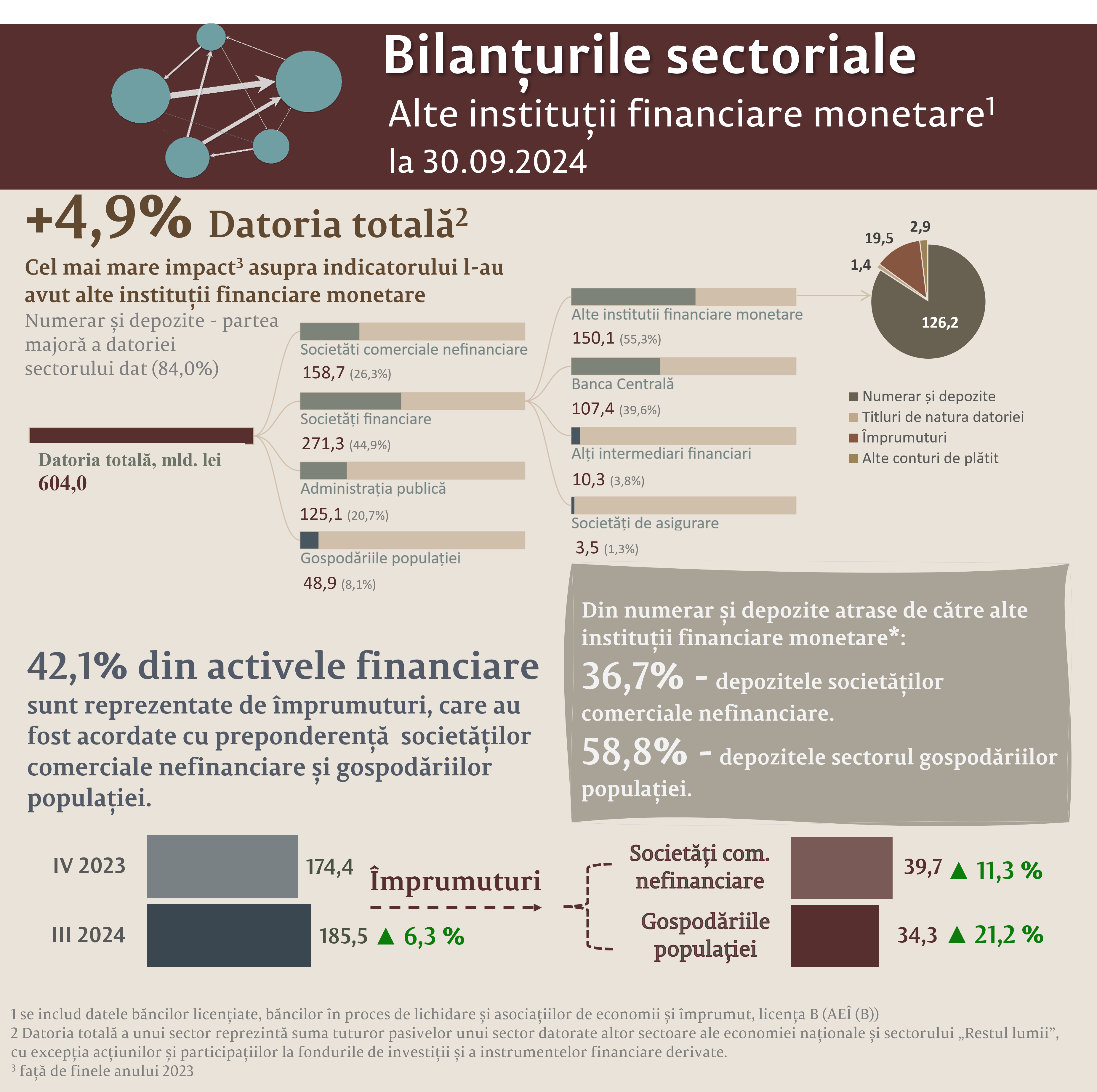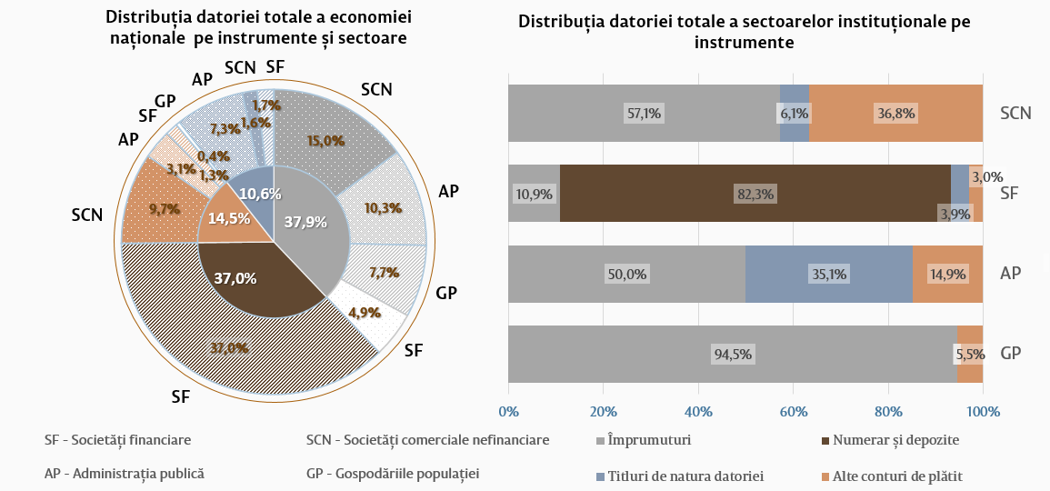 Datoria totală pe economia națională a însumat 604,0 mld. lei (+4,9 la sută comparativ cu situația din 31.12.2023). Sectorul financiar, drept urmare a funcțiilor sale de intermediar financiar, reprezintă sectorul cu cea mai mare datorie totală (271,3 mld. lei sau 44,9 la sută din totalul datoriei pe economia națională). Sectorului societăților comerciale nefinanciare îi revin 158,7 mld. lei sau 26,3 la sută din totalul datoriei, iar sectoarelor administrației publice și gospodăriilor populației 125,1 mld. lei (20,7 la sută) și 48,9 mld. lei (8,1 la sută), respectiv.