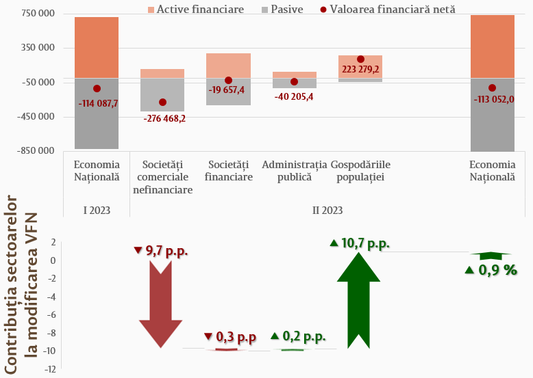 Valoarea financiară netă (VFN)1 a economiei naționale a înregistrat un trend descendent, diminuându-se de la -110 725,3 mil. lei la finele anului 2022 până la -114 087,7 mil. lei la 31.03.2023, iar ulterior valoarea acestui indicator a crescut până la nivelul de -113 052,0 mil. lei la 30.06.2023. Economia națională rămâne în continuare net debitoare față de „Restul lumii”. Evoluția din trimestrul II 2023 s-a datorat creșterii mai accentuate a activelor (+3,9 la sută fața de finele trimestrului I 2023) comparativ cu cea a pasivelor (+3,3 la sută).