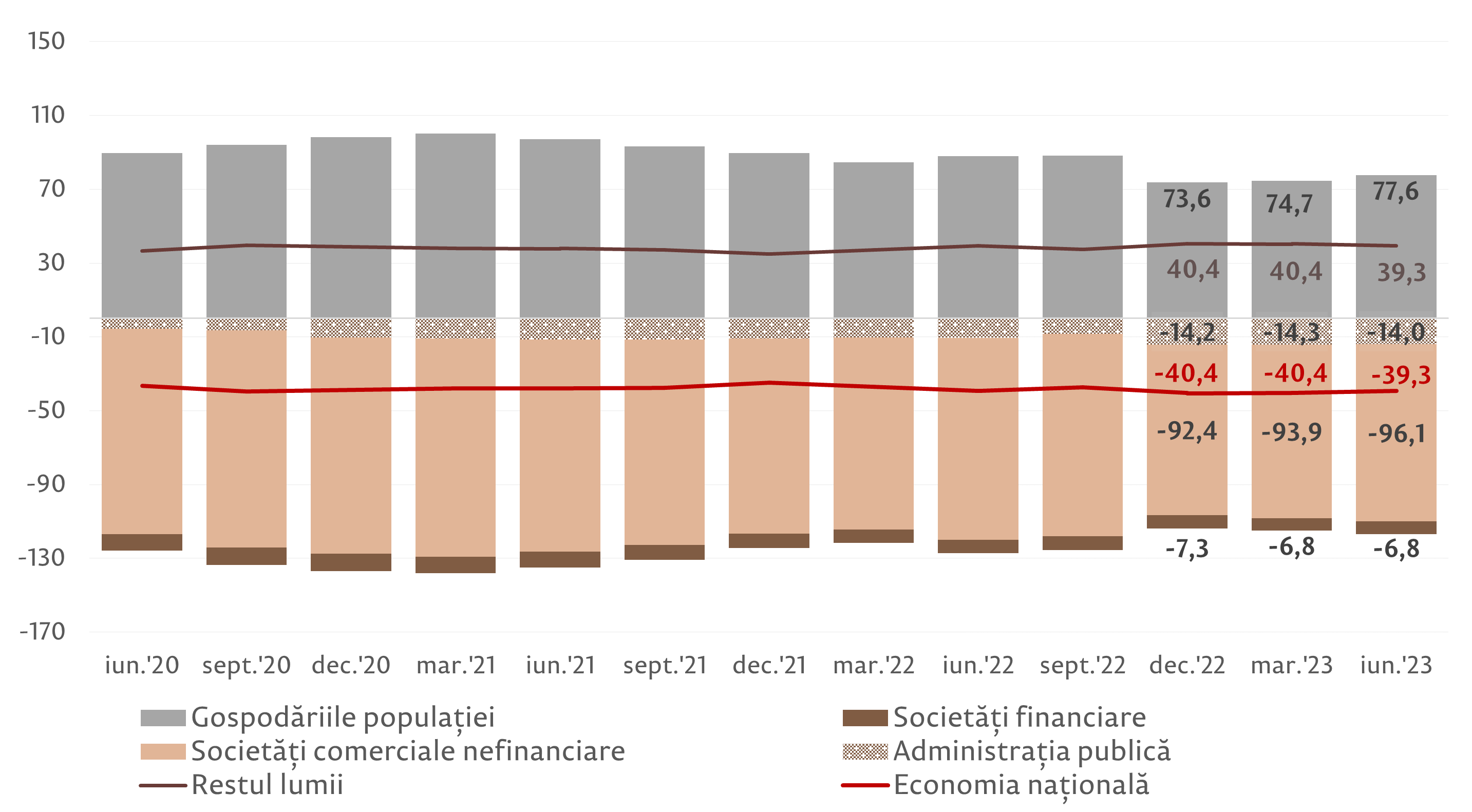 Sectorul gospodăriilor populației continuă să fie creditorul net al economiei naționale, iar sectorul societăților comerciale nefinanciare, sectorul societăților financiare și sectorul administrației publice se află, la fel, ca în perioadele precedente, pe poziția de debitor net (tabelul 1).