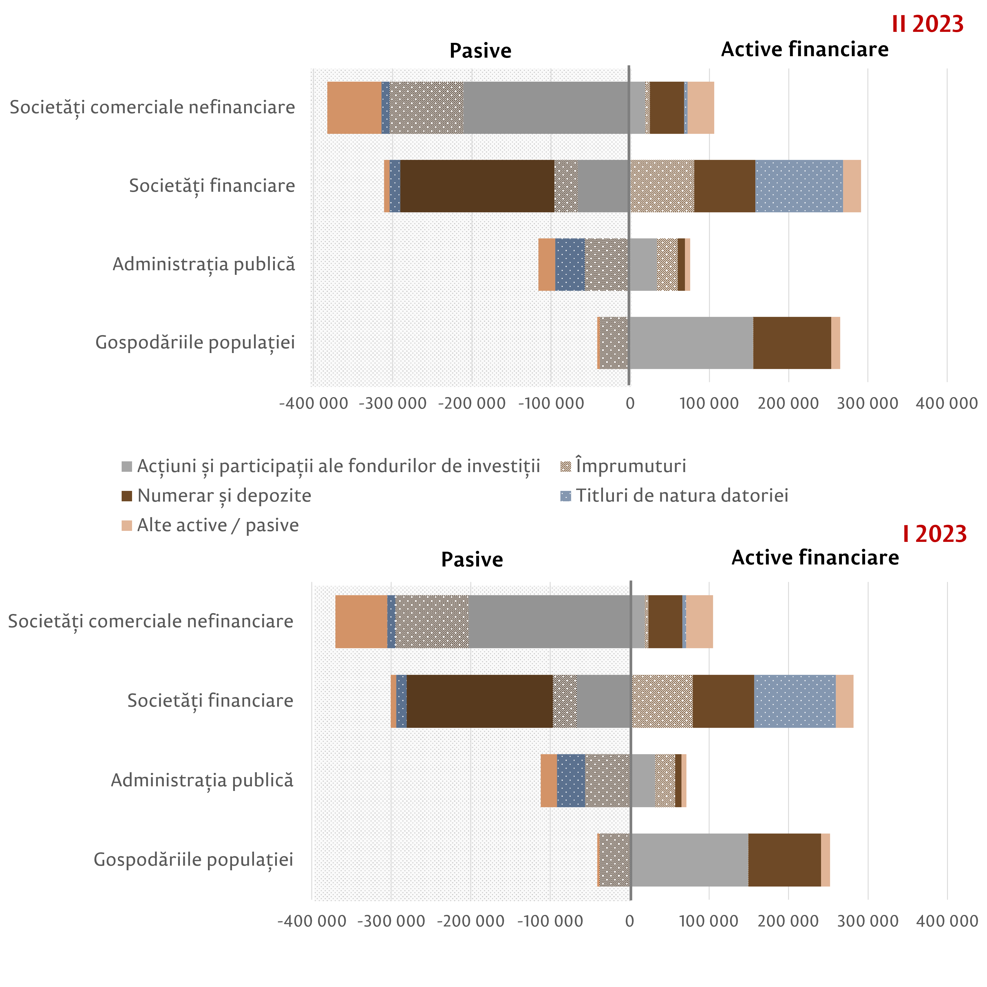 Activele sectorului gospodăriilor populației la finele trimestrului II 2023 au constituit 264 927,3 mil. lei (+5,1 la sută comparativ cu trimestrul I 2023), fiind formate, în mare parte, din participațiile în capital și din numerar și depozite: 58,5 la sută și 37,1 la sută, respectiv, din totalul activelor sectorului dat. Totodată, angajamentele sectorului gospodăriilor populației au însumat 41 648,2 mil. lei (+1,7 la sută comparativ cu trimestrul I 2023), fiind constituite, în principal, din împrumuturi contractate (92,4 la sută din totalul pasivelor).