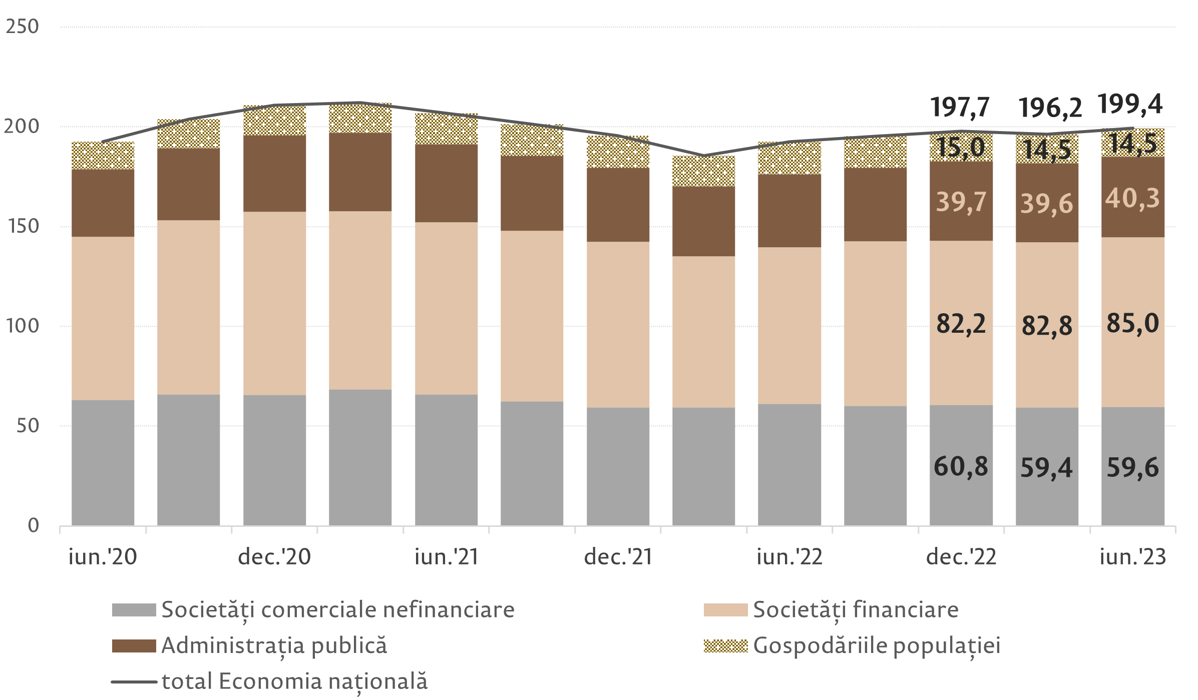 Raportul dintre datoria totală a sectoarelor economiei naționale și PIB, la 30 iunie 2023 a constituit 199,4 la sută, cu 3,1 puncte procentuale superior indicatorului respectiv de la finele trimestrului I 2023. Cea mai semnificativă creștere a fost consemnată în sectorul societăților financiare, indicatorul respectiv în trimestrul II 2023 a atins nivelul de 85,0 la sută (+2,2 puncte procentuale - diagrama 4).