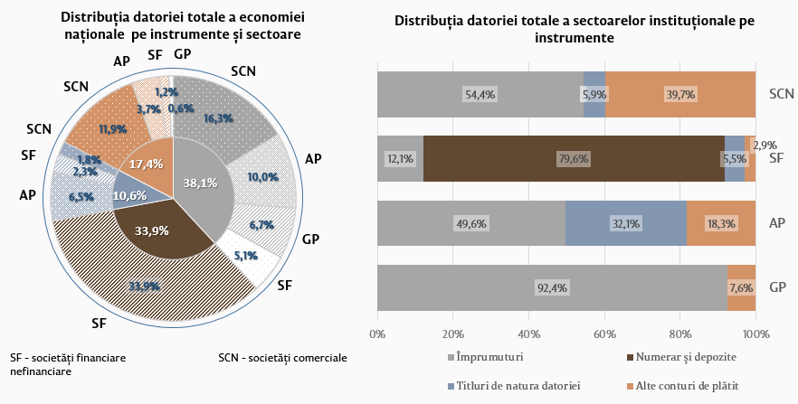 În trimestrul II 2023, datoria totală4 pe economia națională a însumat 573 852,8 mil. lei (+3,5 la sută comparativ cu trimestrul I 2023). Sectorul financiar, drept urmare a funcțiilor sale de intermediar financiar, reprezintă sectorul cu cea mai mare datorie totală (42,6 la sută din totalul datoriei pe economia națională). Sectorului societăților comerciale nefinanciare îi revine 171 652,4 mil. lei sau 29,9 la sută din totalul datoriei, iar sectoarelor administrației publice și gospodăriilor populației – 115 865,9 mil. lei și 41 648,2 mil. lei, ceea ce constituie 20,2 la sută și 7,3 la sută, respectiv, din totalul datoriei pe economia națională.