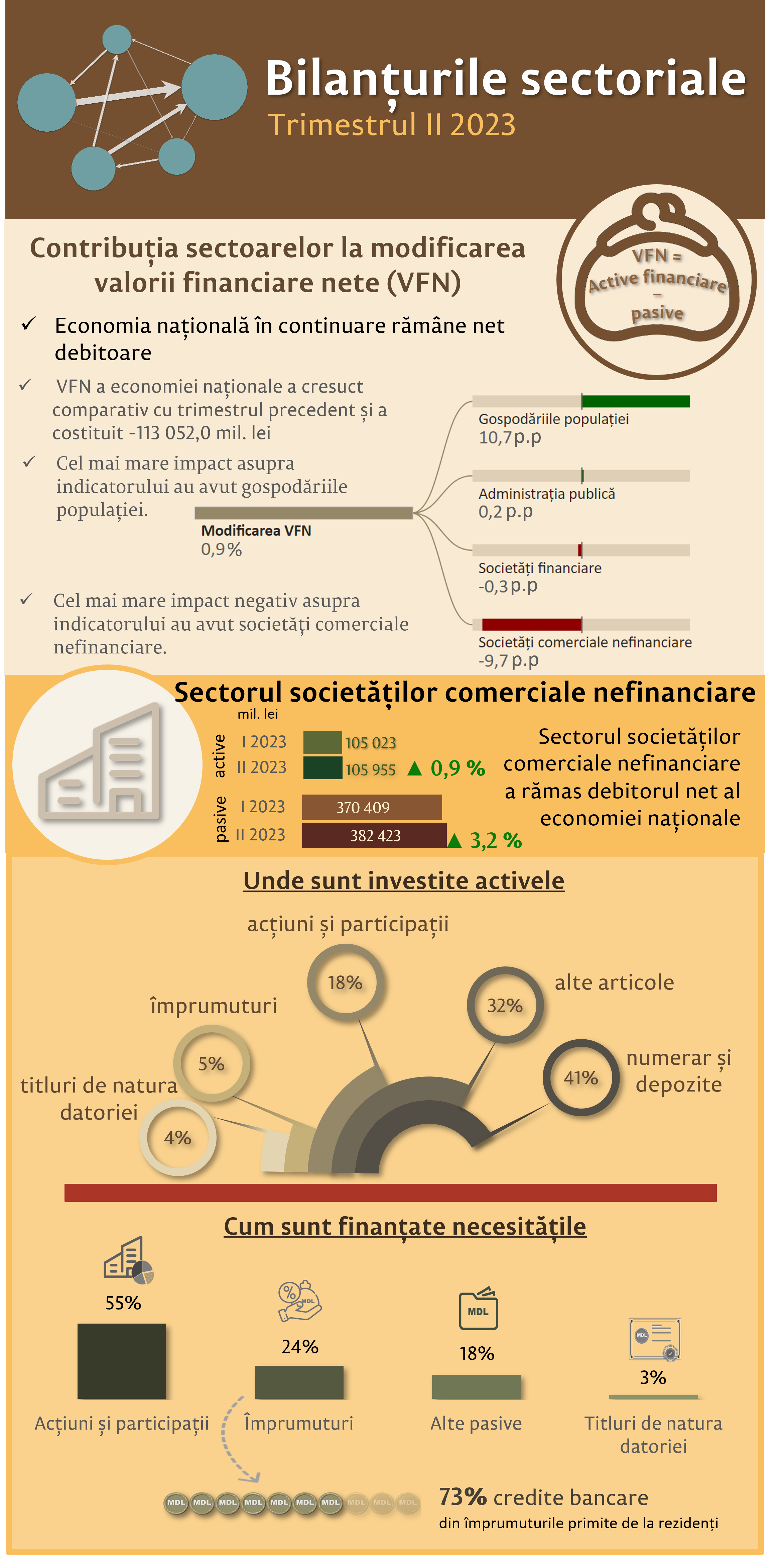 Activele financiare ale sectorului societăților comerciale nefinanciare au totalizat 105 955,3 (+0,9 la sută). În structura lor ponderile majore sunt deținute de numerar și depozite (40,8 la sută din totalul activelor) și de participații în capitalul altor entități instituționale (17,8 la sută din totalul activelor). În același timp, sectorul dat este cel mai mare în economia națională din perspectiva obligațiunilor sale, care în trimestrul II 2023 au constituit 382 423,5 mil. lei (+3,2 la sută comparativ cu trimestrul I 2023), fiind formate, în mare parte, din capitalul propriu (55,1 la sută) și împrumuturile contractate (24,4 la sută din totalul pasivelor sectorului dat).
