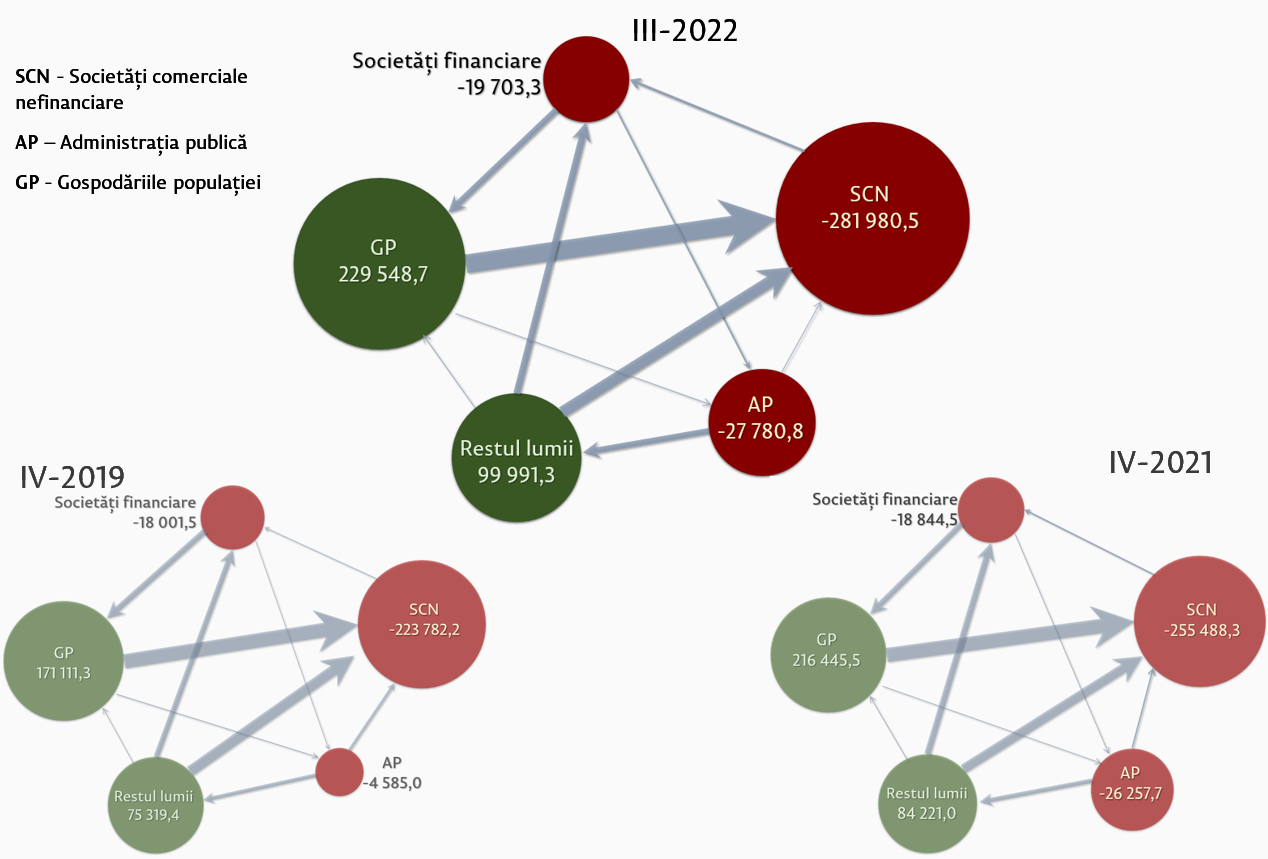 Interdependențele sectoriale sunt prezentate în diagrama 1, unde poate fi vizualizată valoarea financiară netă înregistrată de sectoarele economiei naționale și sectorul „Restul lumii” în trimestrul IV 2019 (situația de până la perioada pandemică), trimestrul IV 2021 și trimestrul III 2022.