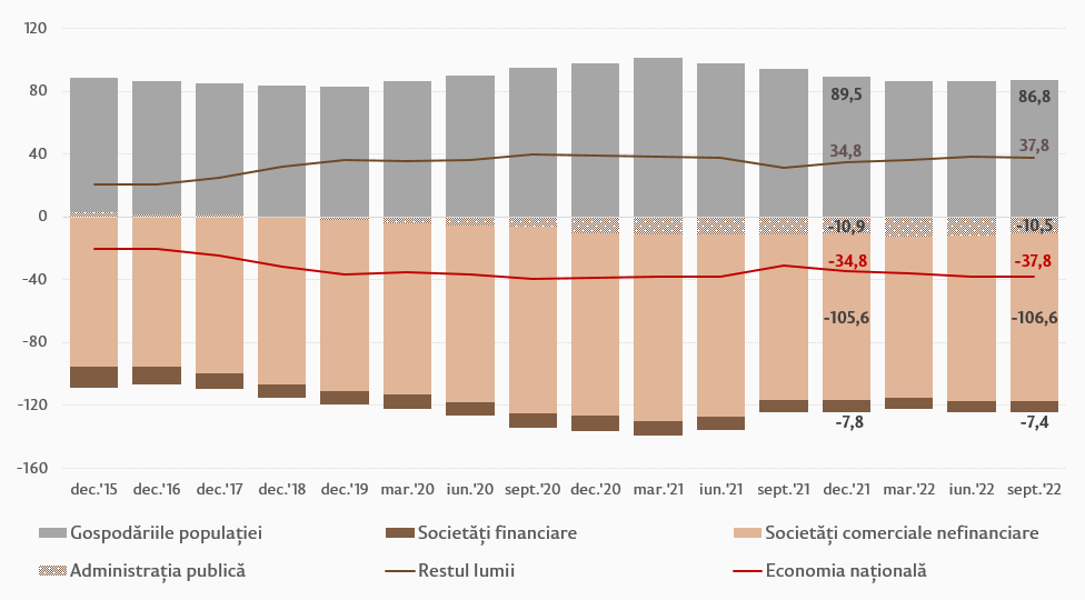 Valoarea financiară netă a economiei naționale s-a diminuat de la -84 145,1 mil. lei în trimestrul IV 2021 până la -99 915,9 mil. lei în trimestrul III 2022, economia națională fiind în continuare net debitoare. Această evoluție se datorează creșterii mai semnificative (+9,6 la sută) a pasivelor față de creșterea activelor (+8,4 la sută).