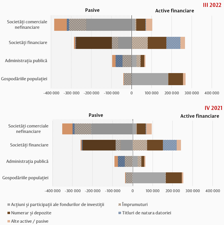 Sectorul societăților comerciale nefinanciare este sectorul în care se înregistrează în continuare cea mai mare valoare financiară netă negativă (debitoare), la finele trimestrului III 2022 aceasta reprezenta -281 980,5 mil. lei (în creștere cu 10,4 la sută). Sectoarele administrației publice și societăților financiare, de asemenea sunt caracterizate printr o valoarea financiară netă negativă (debitoare), însă valoarea acestora este mult mai redusă, de -27 780,8 mil. lei (+ 5,8 la sută) și, respectiv, de -19 703,3 mil. lei (+4,6 la sută).
