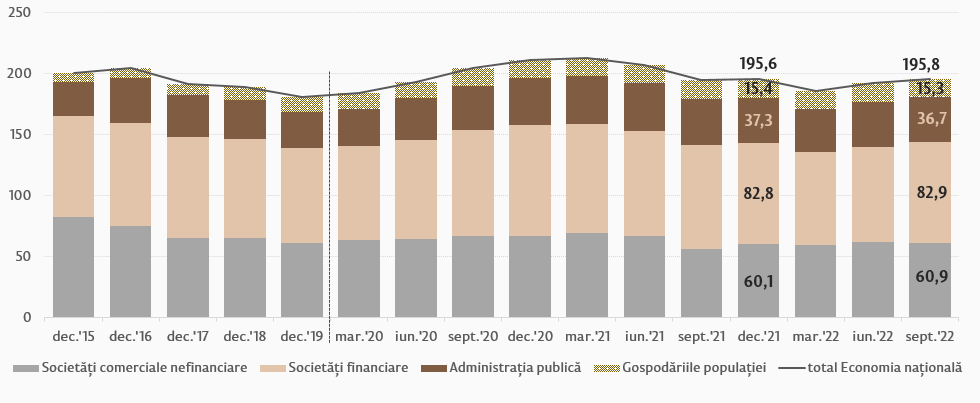 Raportul dintre datoria totală a sectoarelor economiei naționale și PIB a constituit 195,8 la sută. Cea mai semnificativă fluctuație în dinamică a fost consemnată în sectorul societăților comerciale nefinanciare, indicatorul respectiv în trimestrul III 2022 s-a majorat până la nivelul de 60,9 la sută (+0,8 puncte procentuale comparativ cu trimestrul IV 2021).