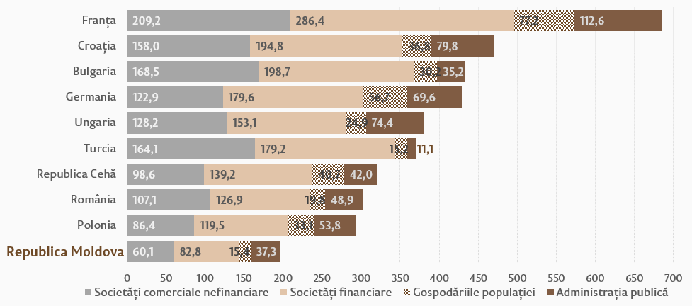O comparație între țări a acestui indicator arată că datoria totală a sectoarelor Republicii Moldova a fost la un nivel scăzut în trimestrul IV 2021 (Diagrama 5).