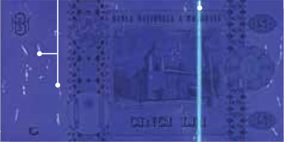 Astfel, pe firul de siguranță metalizat încorporat în hârtie apare textul „BNM”. În lumină ultravioletă firul metalizat are proprietăți de fluorescență de culoare albastră.