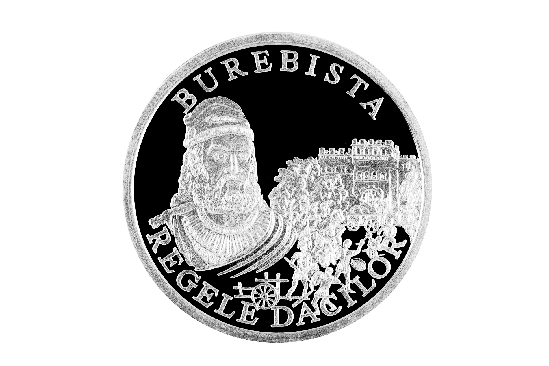 • în partea de sus, urmînd circumferinţa monedei - cu majuscule este gravată inscripţia – “BUREBISTA”;