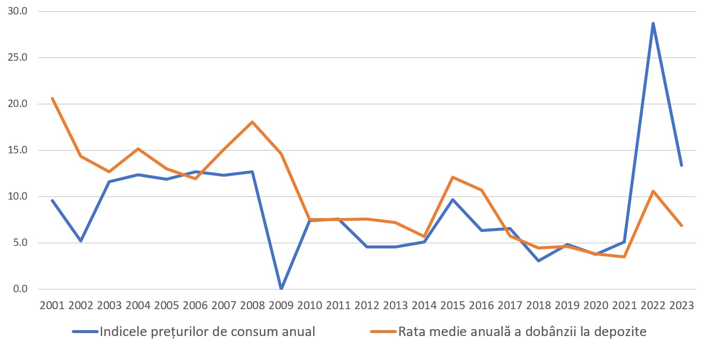Graficul 1: Evoluția ratei medii anuale a dobânzii la depozite în lei moldovenești și a ratei inflației anuale