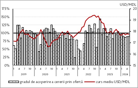 În raport cu luna precedentă, oferta netă de valută de la persoanele fizice a crescut cu 43,4 milioane USD (+19,5%), iar cererea netă de valută din partea agenților economici s-a majorat cu 42,9 milioane USD (+17,0%).
