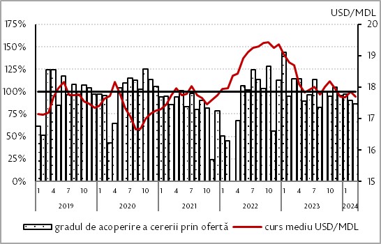 În raport cu luna precedentă, oferta netă de valută de la persoanele fizice a crescut cu 7,6 milioane USD (+4,0%), iar cererea netă de valută din partea agenților economici s-a majorat cu 18,3 milioane USD (+8,6%).