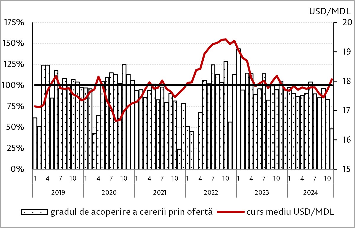 În raport cu luna precedentă, oferta netă de valută de la persoanele fizice a scăzut cu 80,8 milioane USD (-33,3%), iar cererea netă de valută din partea agenților economici a sporit cu 43,2 milioane USD (14,8%).