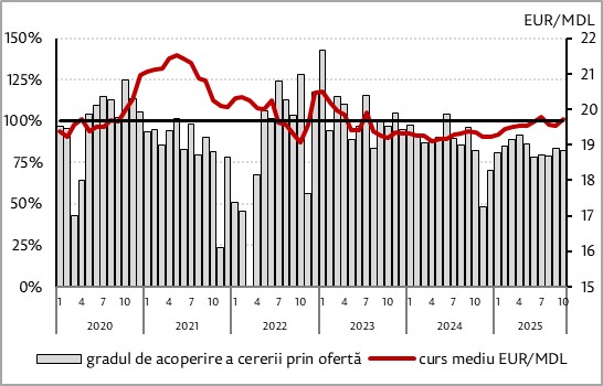 În luna octombrie 2025, gradul de acoperire a cererii nete de valută din partea agenților economici prin oferta netă de valută de la persoanele fizice1 a constituit 82,0% comparativ cu 83,6% în luna septembrie 2025.