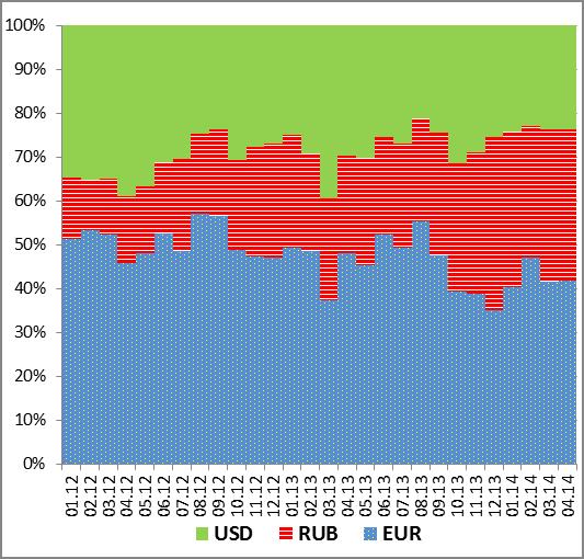 Scăderea ofertei nete de valută străină de la persoanele fizice a fost determinată, preponderent, de  reducerea vânzărilor de dolari SUA (cu 32.4 la sută) și euro (cu 26.4 la sută) de către persoanele fizice, fiind atenuată de sporirea vânzărilor de ruble ruseşti (cu 31.6 la sută). În ceea ce priveşte structura valutară a ofertei nete de valută străină de la persoanele fizice, ponderea majoritară i-a revenit monedei euro (41.5 la sută comparativ cu 47.9 la sută aprilie 2013), fiind urmată de rubla rusească (34.5 la sută comparativ cu 22.3 la sută în aprilie 2013) şi de dolarul SUA (23.6 la sută comparativ cu 29.7 la sută în aprilie 2013).