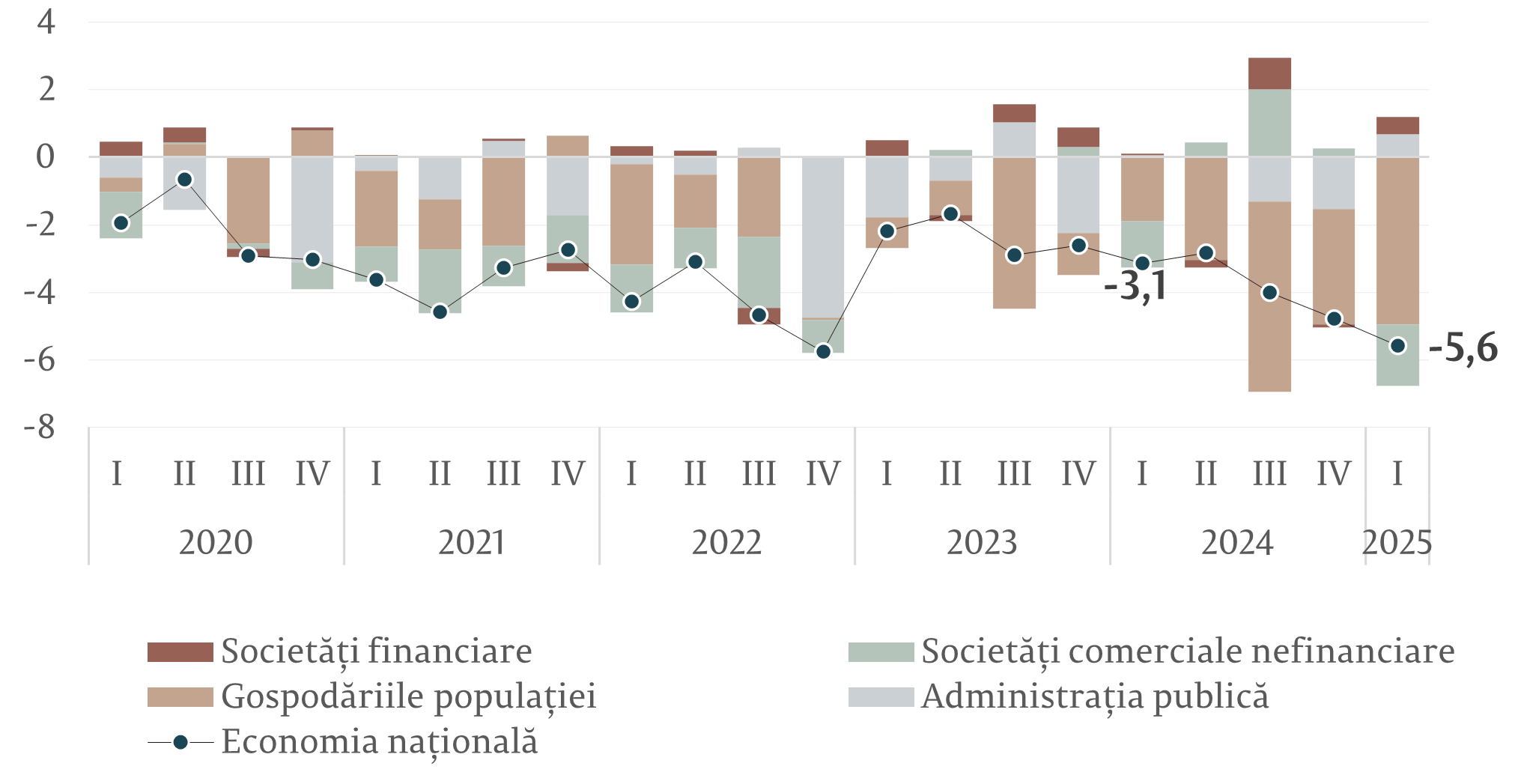 Capacitatea netă (+) / necesarul net (-) de finanțare a sectoarelor economiei naționale raportată la PIB, %