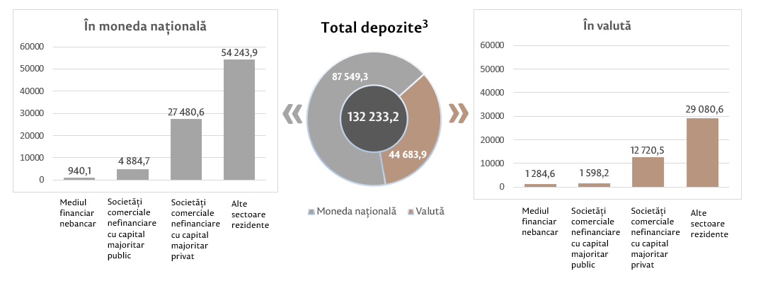 Soldul depozitelor în moneda națională a constituit 87 549,3 milioane lei, în creștere cu 68,8 milioane lei comparativ cu luna precedentă, reprezentând o pondere de 66,2 la sută în soldul total al depozitelor. Totodată, soldul depozitelor în valută (recalculat în lei) a constituit 44 683,9 milioane lei, majorându-se cu 1 449,0 milioane lei comparativ cu luna precedentă, având o pondere de 33,8 la sută (diagrama 3).