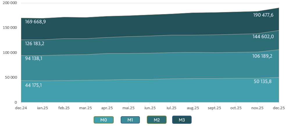 Masa monetară M36 a constituit 190 477,6 milioane lei, fiind în creștere cu 3,8 la sută față de luna noiembrie 2025 sau cu 12,3 la sută față de perioada similară a anului precedent.