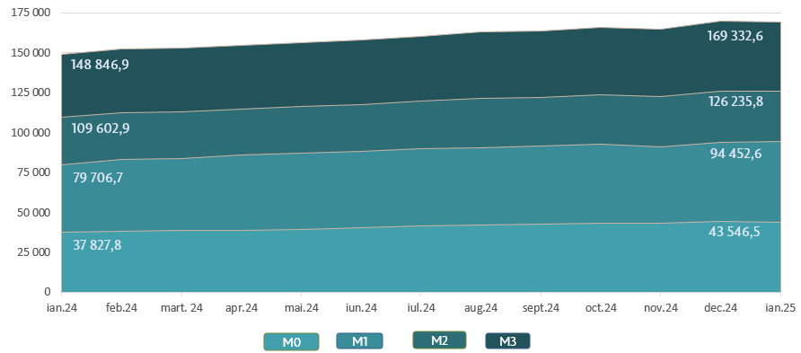Masa monetară M14 s-a majorat cu 381,9 milioane lei sau cu 0,4 la sută față de luna decembrie 2024 și a constituit 94 452,6 milioane lei, în creștere cu 18,5 la sută față de perioada similară a anului precedent.
