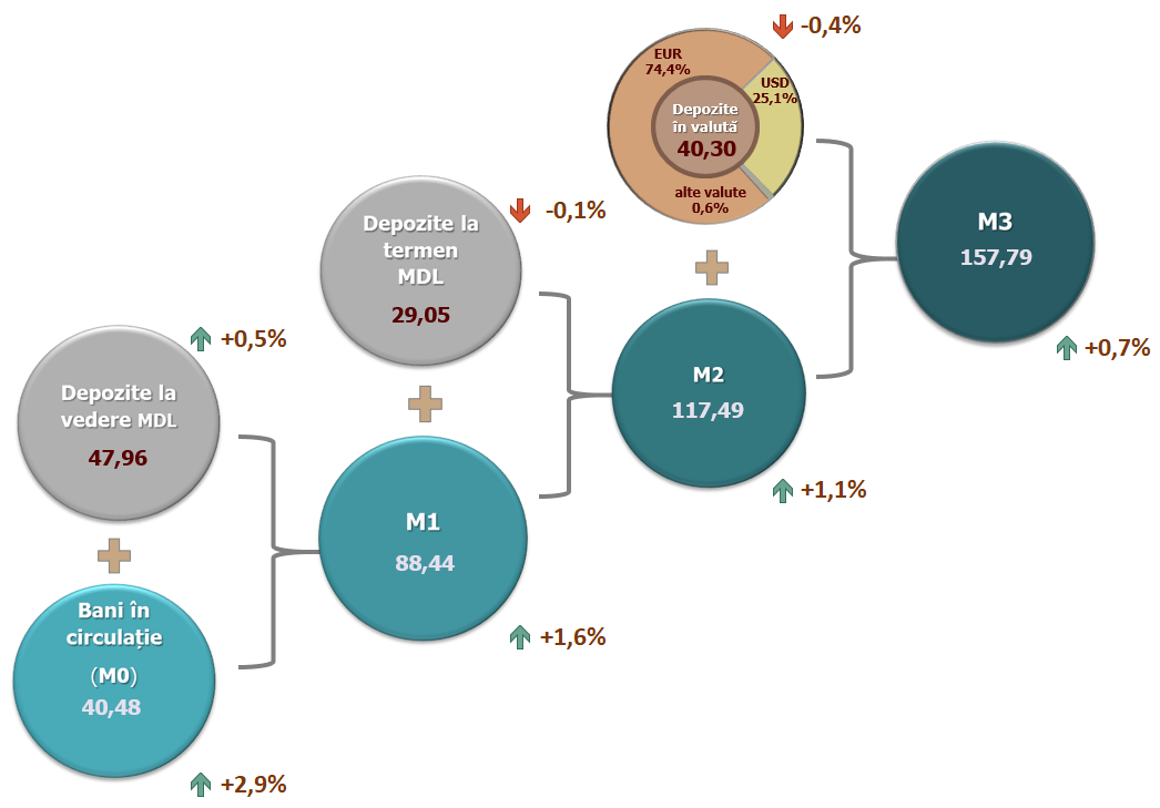 4. Masa monetară M1 include banii în circulație (M0) și depozitele la vedere în lei moldovenești ale rezidenților.