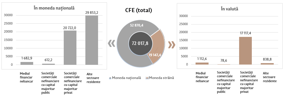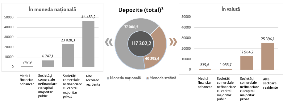 Soldul depozitelor în moneda națională s-a majorat cu 180,1 milioane lei comparativ cu luna precedentă și a constituit 77 006,5 milioane lei, reprezentând o pondere de 65,6 la sută din soldul total al depozitelor. Totodată, soldul depozitelor în valută (recalculat în lei) s-a micșorat cu 168,7 milioane lei comparativ cu luna precedentă, până la nivelul de 40 295,6 milioane lei, având o pondere de 34,4 la sută (diagrama 3).