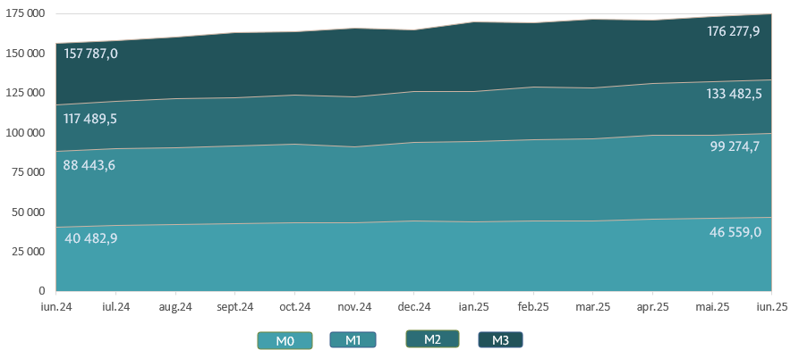 Masa monetară M25 s-a majorat cu 1 138,4 milioane lei sau cu 0,9 la sută față de luna mai 2025 și a constituit 133 482,5 milioane lei, în creștere cu 13,6 la sută față de perioada similară a anului precedent (diagrama 2).