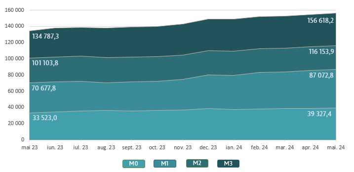 Masa monetară M36 s-a majorat cu 1 831,1 milioane lei (+1,2 la sută) față de luna aprilie 2024 și a constituit 156 618,2 milioane lei, fiind cu 16,2 la sută mai mare față de perioada similară a anului precedent.