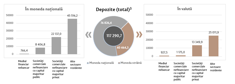 Soldul depozitelor în moneda națională s-a majorat cu 876,8 milioane lei comparativ cu luna precedentă și a constituit 76 826,4 milioane lei, reprezentând o pondere de 65,5 la sută din soldul total al depozitelor. Totodată, soldul depozitelor în valută (recalculat în lei) s-a majorat cu 399,9 milioane lei comparativ cu luna precedentă, până la nivelul de 40 464,3 milioane lei, având o pondere de 34,5 la sută (diagrama 3).