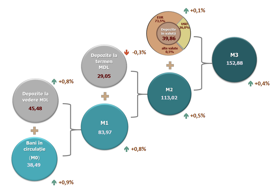 4. Masa monetară M1 include banii în circulație (M0) și depozitele la vedere în lei moldovenești ale rezidenților.