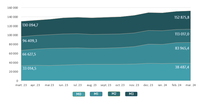Masa monetară M36 s-a majorat cu 658,0 milioane lei (0,4 la sută) față de luna februarie 2024 și a constituit 152 875,8 milioane lei, fiind cu 17,5 la sută mai mare față de perioada similară a anului precedent.