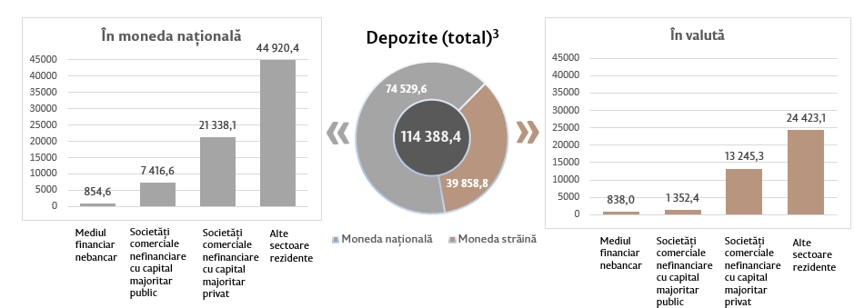 Soldul depozitelor în moneda națională s-a majorat cu 270,1 milioane lei comparativ cu luna precedentă și a constituit 74 529,6 milioane lei, reprezentând o pondere de 65,2 la sută din soldul total al depozitelor. Totodată, soldul depozitelor în valută (recalculat în lei) s-a majorat cu 54,7 milioane lei comparativ cu luna precedentă, până la nivelul de 39 858,8 milioane lei, având o pondere de 34,8 la sută (diagrama 3).