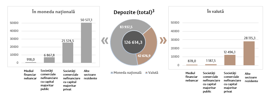 Soldul depozitelor în moneda națională s-a micșorat cu 445,6 milioane lei comparativ cu luna precedentă și a constituit 83 937,5 milioane lei, reprezentând o pondere de 66,3 la sută în soldul total al depozitelor. Totodată, soldul depozitelor în valută (recalculat în lei) s-a micșorat cu 591,6 milioane lei comparativ cu luna precedentă, până la nivelul de 42 676,9 milioane lei, având o pondere de 33,7 la sută (diagrama 3).