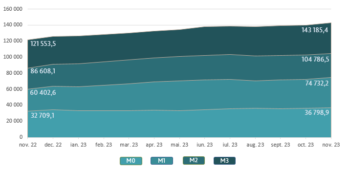 Masa monetară M36 s-a majorat cu 2 980,6 milioane lei (+2,1 la sută) față de luna octombrie 2023 și a constituit 143 185,4 milioane lei, fiind cu 17,8 la sută mai mare față de perioada similară a anului precedent.