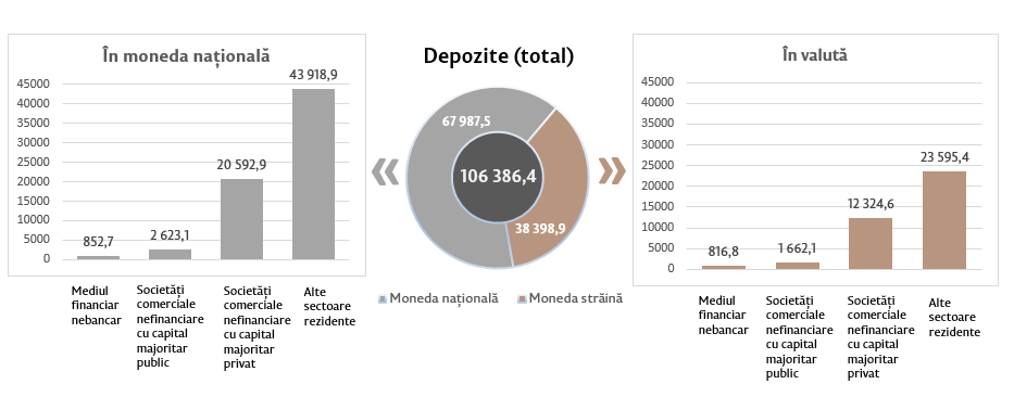 Soldul depozitelor în moneda națională s-a majorat cu 1 479,1 milioane lei comparativ cu luna precedentă și a constituit 67 987,5 milioane lei, reprezentând o pondere de 63,9 la sută din soldul total al depozitelor. Totodată, soldul depozitelor în valută (recalculat în lei) s-a majorat cu 770,3 milioane lei comparativ cu luna precedentă, până la nivelul de 38 398,9 milioane lei, având o pondere de 36,1 la sută (diagrama 3).