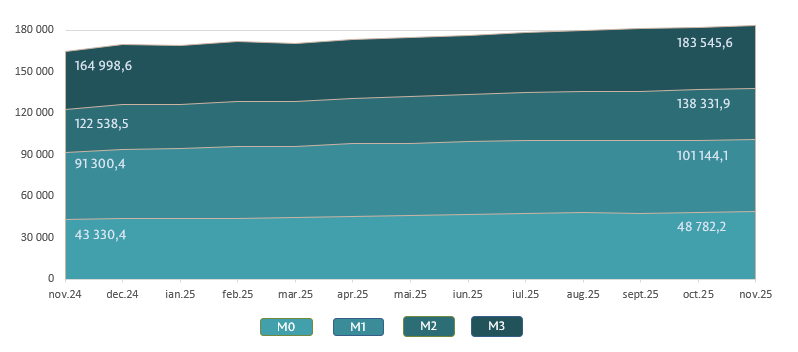 Masa monetară M36 a constituit 183 545,6 milioane lei, fiind în creștere cu 0,7 la sută față de luna octombrie 2025 sau cu 11,2 la sută față de perioada similară a anului precedent.
