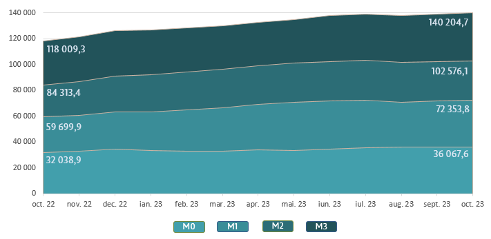 Masa monetară M36 s-a majorat cu 989,3 milioane lei (+0,7 la sută) față de luna septembrie 2023 și a constituit 140 204,7 milioane lei, fiind cu 18,8 la sută mai mare față de perioada similară a anului precedent.