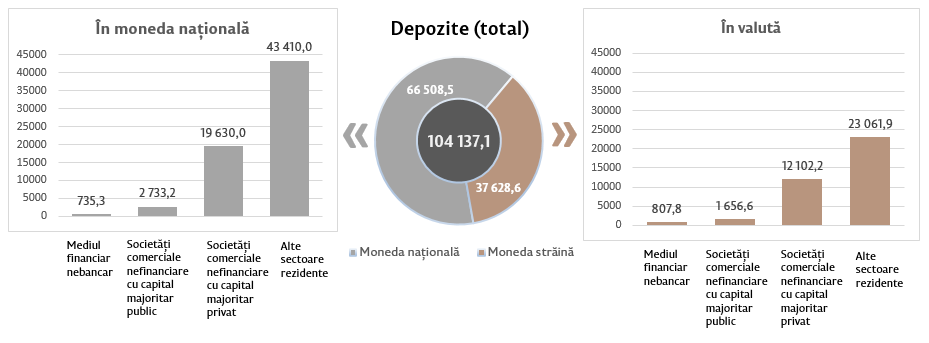 Soldul depozitelor în moneda națională s-a majorat cu 532,9 milioane lei comparativ cu luna precedentă și a constituit 66 508,5 milioane lei, reprezentând o pondere de 63,9 la sută din soldul total al depozitelor. Totodată, soldul depozitelor în valută (recalculat în lei) s-a majorat cu 355,1 milioane lei comparativ cu luna precedentă, până la nivelul de 37 628,6 milioane lei, având o pondere de 36,1 la sută (diagrama 3).