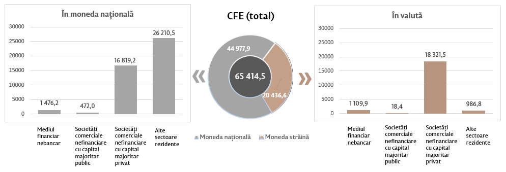 Soldul cererilor față de economie8 (diagrama 4) a constituit 65 414,5 milioane lei, majorându-se în luna octombrie 2023 comparativ cu luna septembrie 2023 cu 383,5 milioane lei (+0,6 la sută), ca urmare a creșterii cererilor față de economie în moneda națională cu 584,3 milioane lei (+1,3 la sută) și a micșorării cererilor față de economie în valută (exprimate în MDL) cu 200,8 milioane lei (-1,0 la sută).