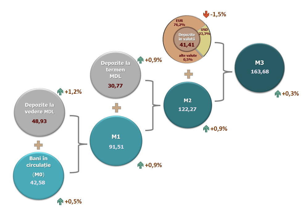 4. Masa monetară M1 include banii în circulație (M0) și depozitele la vedere în lei moldovenești ale rezidenților.