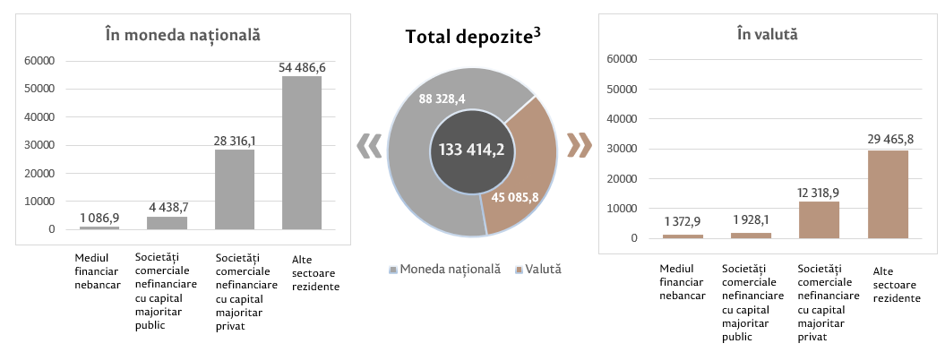 Soldul depozitelor în moneda națională a constituit 88 328,4 milioane lei, în creștere cu 779,0 milioane lei comparativ cu luna precedentă, reprezentând o pondere de 66,2 la sută în soldul total al depozitelor. Totodată, soldul depozitelor în valută (recalculat în lei) a constituit 45 085,8 milioane lei, majorându-se cu 401,9 milioane lei comparativ cu luna precedentă, având o pondere de 33,8 la sută (diagrama 3).
