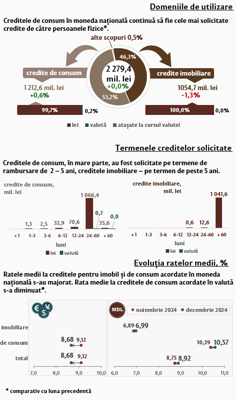 Persoanele fizice au contractat în luna decembrie 2024 credite în volum de 2 279,4 milioane lei (Infografic 2), la fel ca în luna precedentă, partea majoră (53,2 la sută) fiind acordată pentru consum. Majoritatea creditelor de consum acordate persoanelor fizice (1 066,4 milioane lei) au fost acordate în moneda națională pe termene de la 2 până la 5 ani.