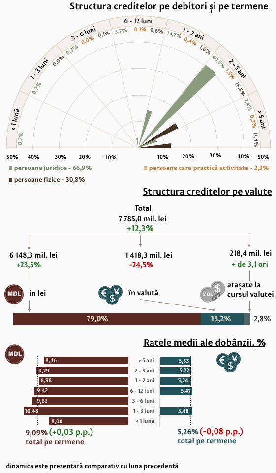 Rata medie la creditele de consum acordate în moneda națională s-a majorat cu 0,14 p.p. și a constituit 11,17 la sută. Rata medie la creditele imobiliare acordate în moneda națională s-a majorat cu 0,10 p.p., constituind 8,24 la sută.