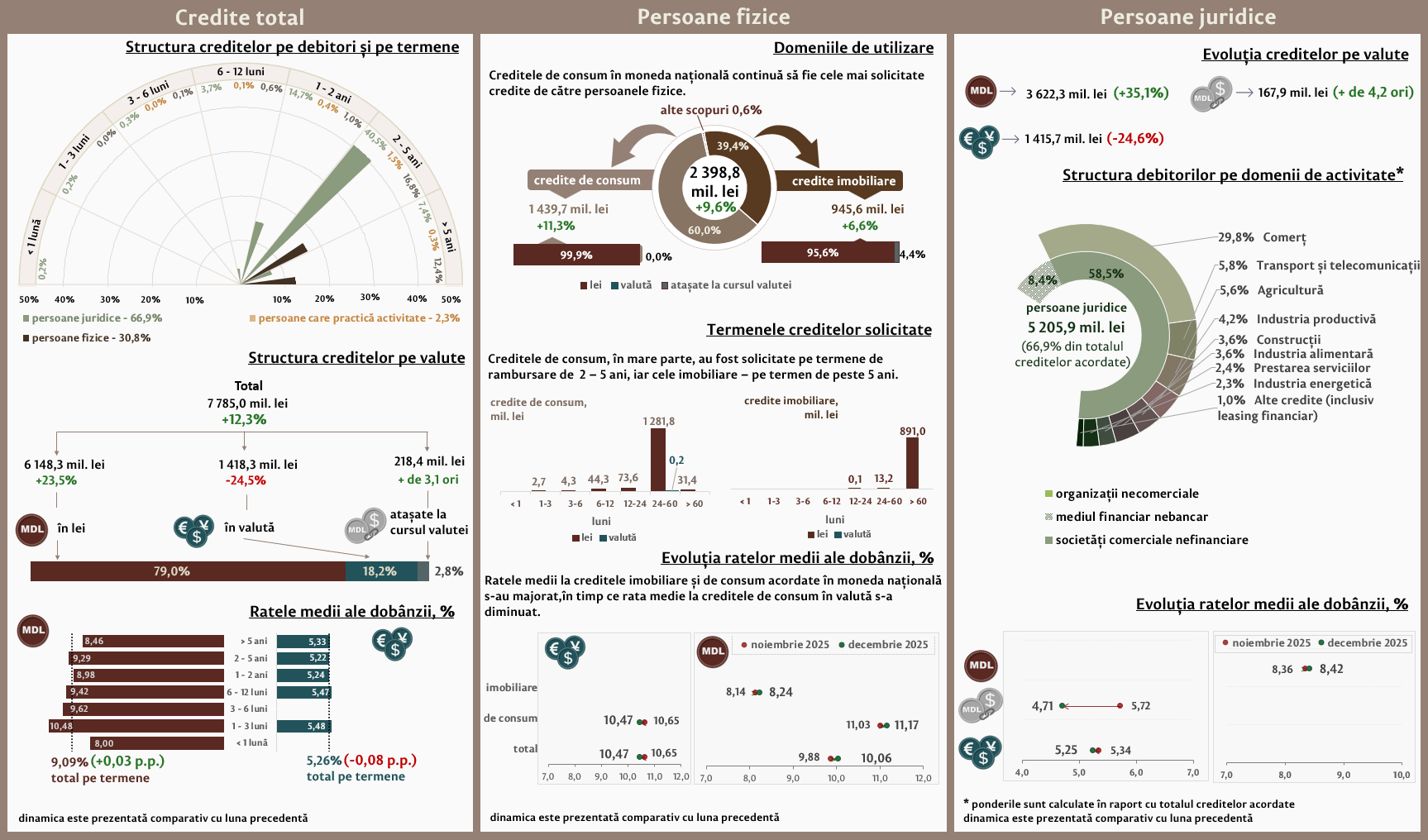 Persoanele fizice în luna decembrie 2025 au contractat credite în volum de 2 398,8 milioane lei, în creștere cu 9,6 la sută față de luna precedentă, partea majoră (60,0 la sută) fiind acordată pentru consum (Infografic 2). Majoritatea creditelor de consum acordate persoanelor fizice (1 281,8 milioane lei) au fost acordate în moneda națională pe termene de la 2 până la 5 ani.