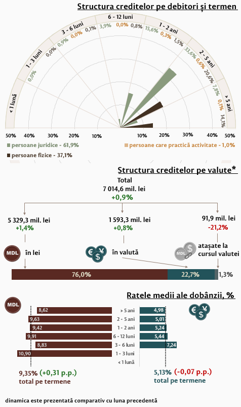 Rata medie la creditele de consum acordate în moneda națională s-a majorat cu 0,17 p.p. și a constituit 10,95 la sută. Rata medie la creditele imobiliare acordate în moneda națională s-a majorat cu 0,90 p.p., constituind 8,25 la sută.