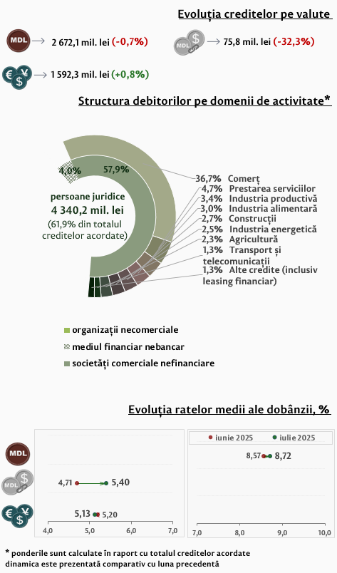 Partea majoră (93,5 la sută) din totalul creditelor noi acordate persoanelor juridice a fost contractată de către societățile comerciale nefinanciare, acestea reprezentând 57,9 la sută din totalul creditelor noi acordate în luna iulie 2025.