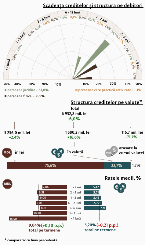 Rata medie la creditele de consum acordate în moneda națională s-a majorat cu 0,24 p. p. și a constituit 10,78 la sută. Rata medie la creditele imobiliare acordate în moneda națională s-a majorat cu 0,21 p. p., constituind 7,35 la sută.